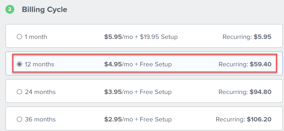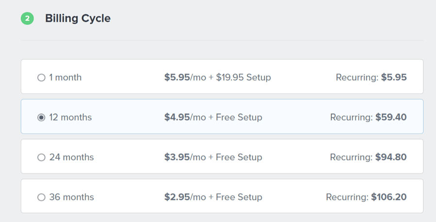 ส่วนที่สองคือ Billing Cycle ให้เลือกว่าจะชำระเงินทุกๆ กี่เดือน (1, 12, 24, หรือ 36 เดือน) รอบยิ่งนานราคาต่อเดือนยิ่งถูก แนะนำว่าให้เลือกชำระทุก 12 เดือน (แต่ถ้าอยากเลือกรอบนานกว่านั้นให้เลือก 36 เดือนไปเลยเพราะแพงกว่าแบบ 24 เดือนแค่นิดเดียว)