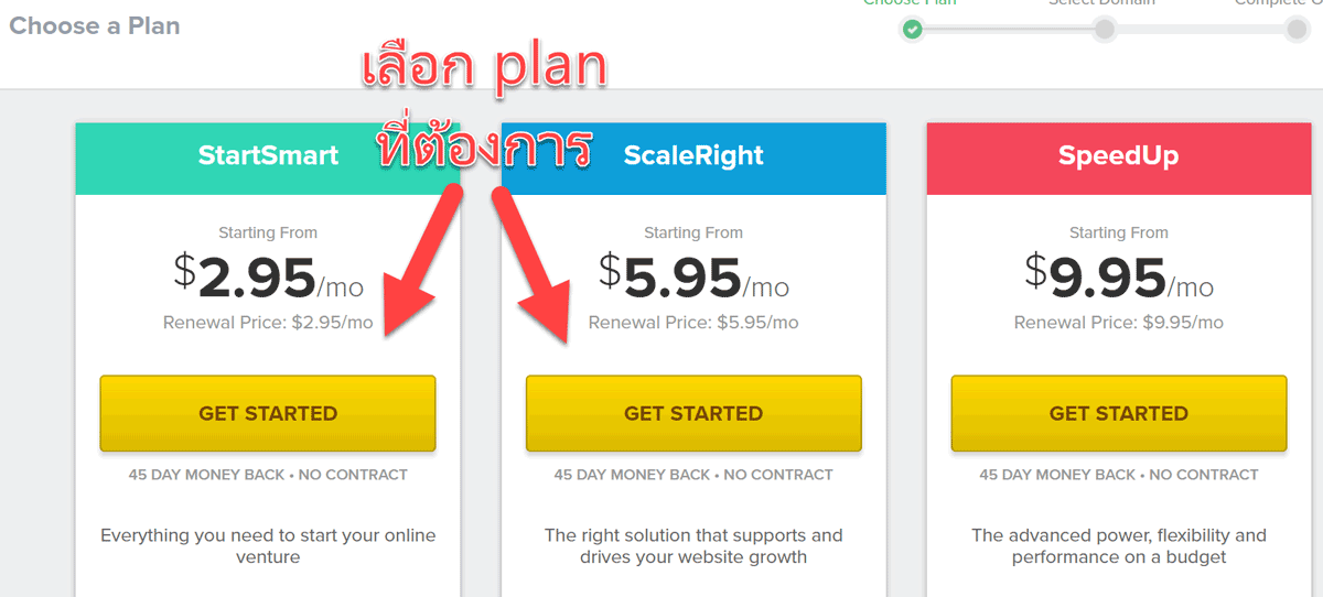 จากนั้นเลือกว่าจะเอาเว็บโฮสติ้งคุณภาพระดับไหน ถ้าคุณจะสร้างแค่เว็บไซต์เดียว เลือก plan ที่ถูกที่สุดก็ได้ครับ นั่นคือ StartSmart ด้านซ้าย แต่ถ้าต้องการสร้างหลายเว็บให้เลือก ScaleRight (ถ้าไม่แน่ใจเลือก StartSmart ก่อนก็ได้ คุณสามารถอัพเกรดที่หลังได้โดยจ่ายแค่ค่าส่วนต่าง)