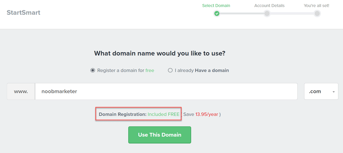หน้าถัดไปให้คุณพิมพ์ชื่อโดเมนที่คุณต้องการ (เนื่องจากโดเมนแถมฟรี คุณจะประหยัดไป 13.95 เหรียญต่อปี) จากนั้นกด Use This Domain (ถ้าคุณจดโดเมนกับที่อื่นไปก่อนแล้ว ให้เลือก “I already have a Domain”)