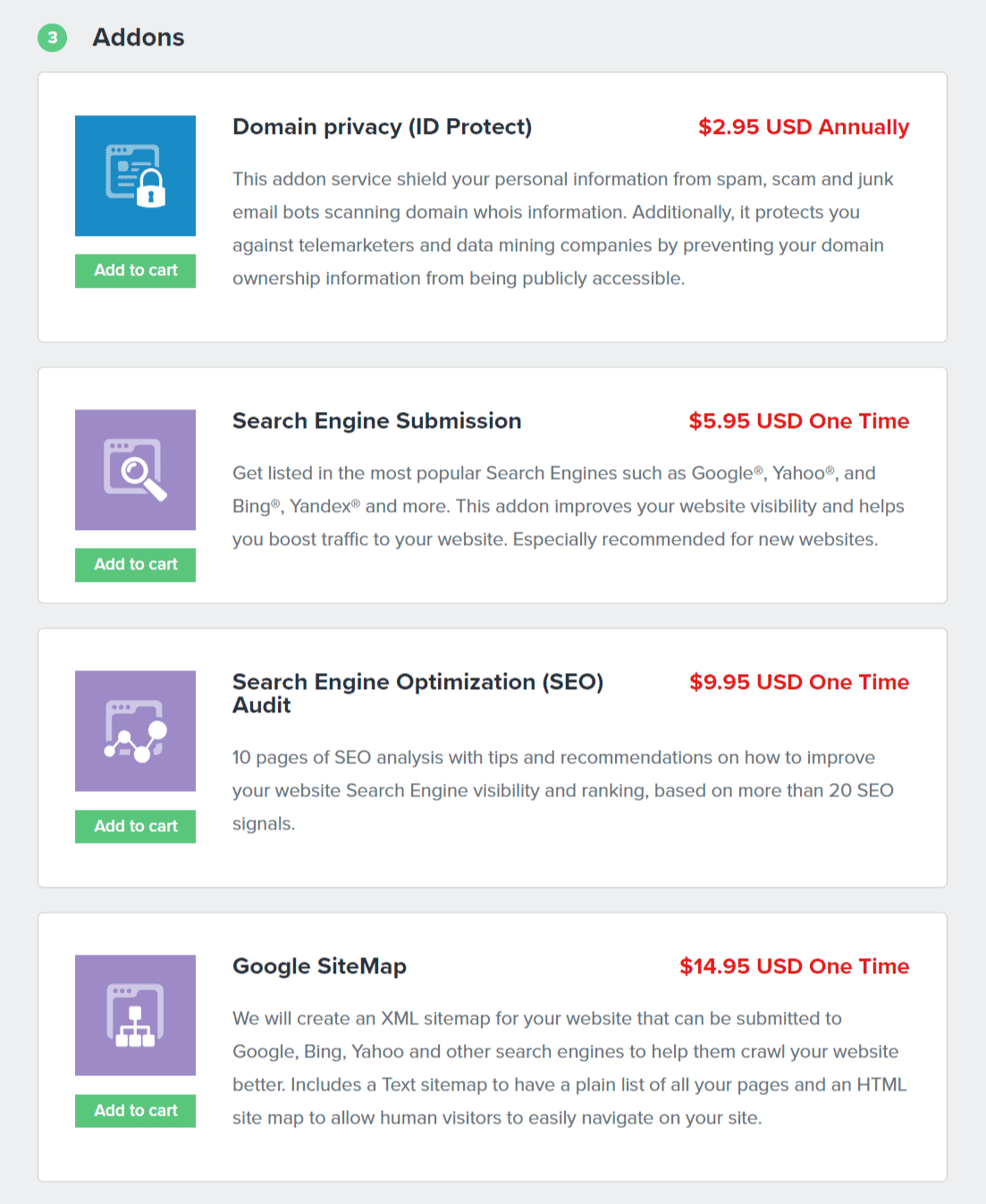 ต่อมาคือส่วน Addons (บริการเสริม) ให้เลือกว่าจะซื้อบริการเสริมอะไรบ้าง (อ่านคำอธิบายด้านล่าง)