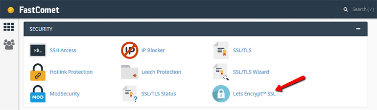 เช่นเดียวกับขึ้นตอนที่แล้ว ให้ไปที่ cPanel แล้วมองหาไอคอนชื่อ Lets Encrypt™ SSL (ปกติจะอยู่ในหมวด Security)